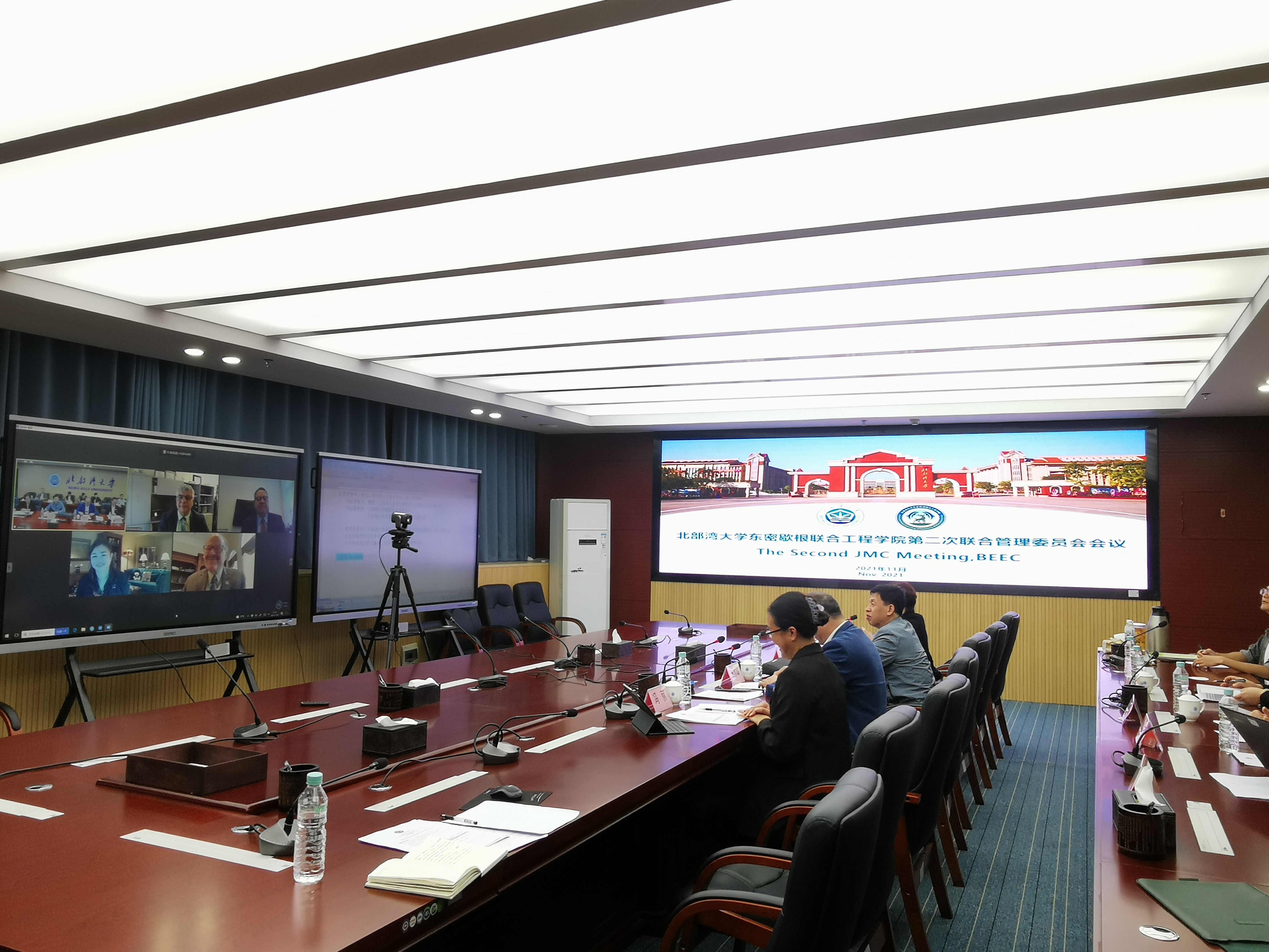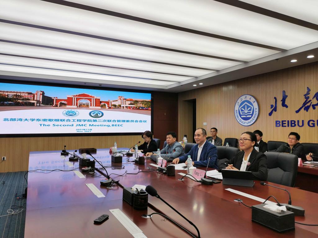 北京时间11月30日晚上9点30分(美国东部时间11月30日早上8点30分),北部湾大学东密歇根联合工程学院(以下简称联合工程学院)联合管理委员会第二次视频会议在国际交流中心346会议室召开。校党委常委、副校长、联合工程学院院长唐高华,机械与船舶制造学院院长、联合工程学院常务副院长邱成军,国际交流处处长、联合工程学院副院长冯丽,美国东密歇根大学(以下简称EMU)校长 James Smith,副校长Kevin Kucera,工程技术学院院长Mohamad Qatu,国际合作部主任Eva Ye出席会议。会议由唐高华主持。