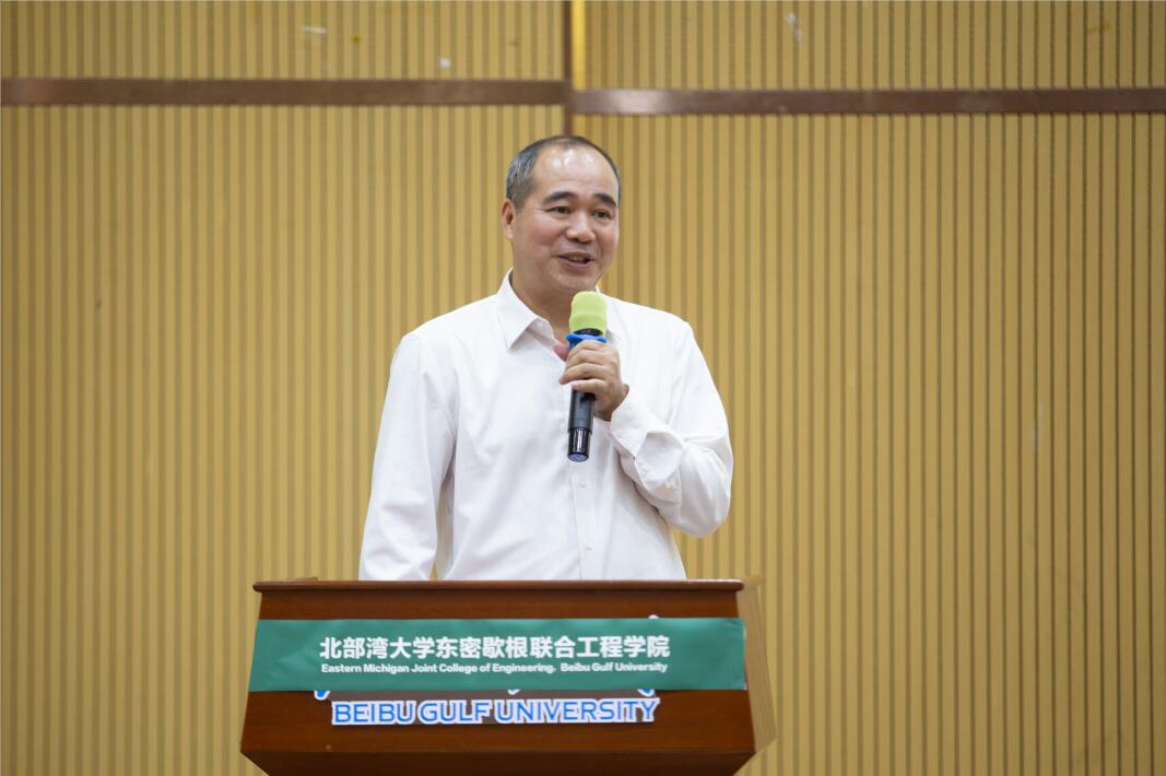 其次,我院教师代表吴宁教授上台发言。吴宁教授讲到联合工程学院的蓬勃发展使他感到无比高兴和心怀感谢,学院通过两校资源整合为学生提供优质的师资力量、教学环境和管理团队,为培养高水平国际化人才提供智力支持和物质基础,北部湾大学和东密歇根大学都将由此获益。