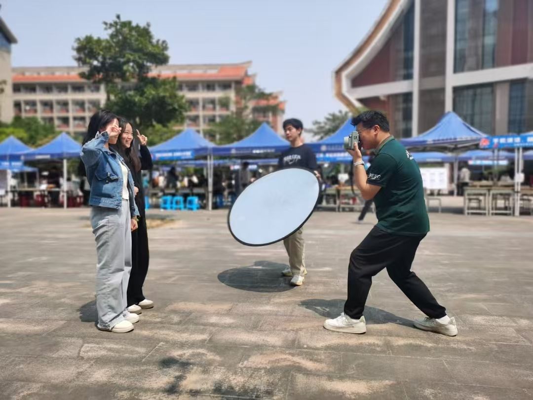 活动现场,志愿者们架起专业摄影设备,提供创意合影、即时打印等特色服务,吸引众多师生驻足参与。