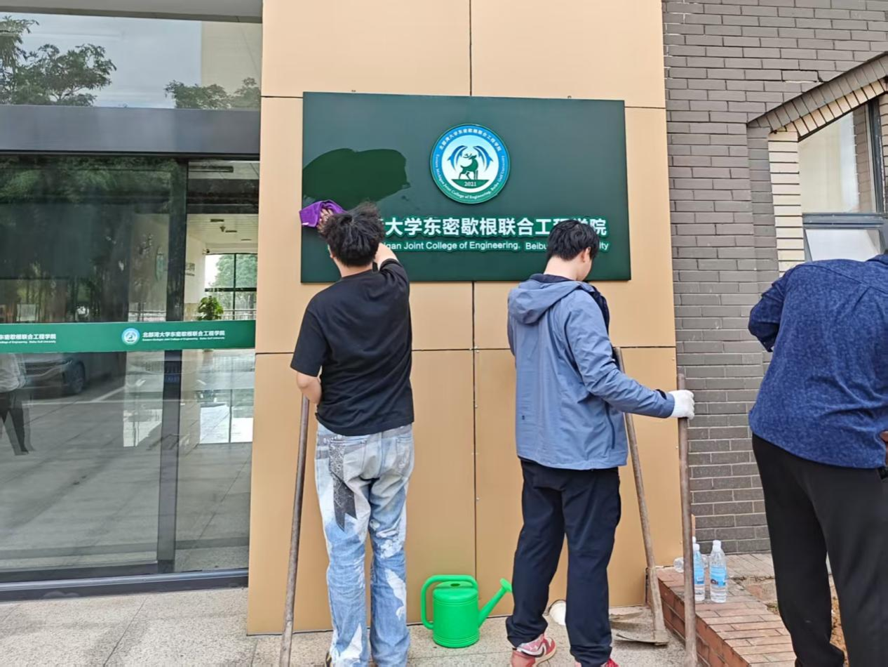 现场志愿者对学院大门进行清洁