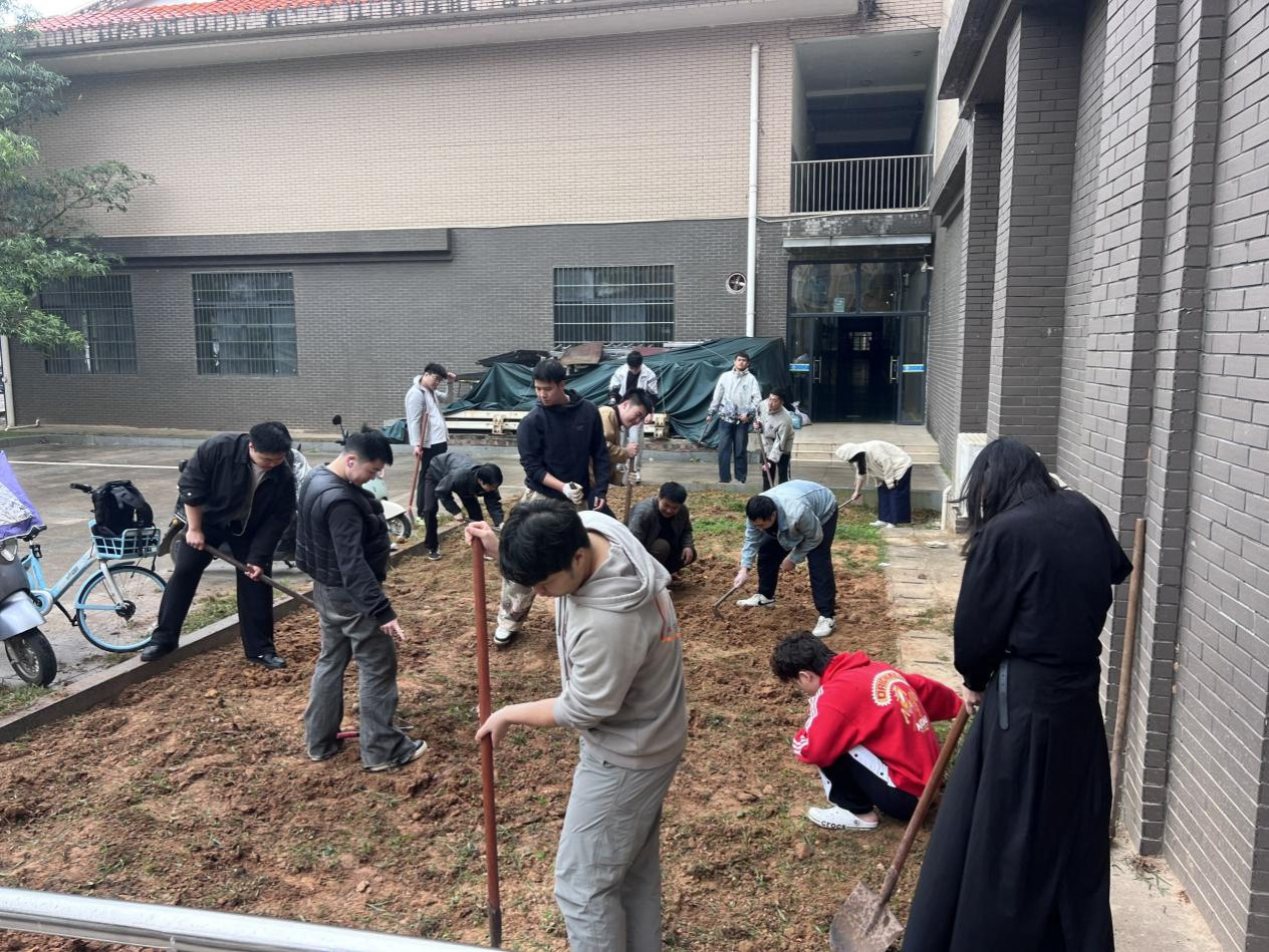 活动现场,同学们对绿化带翻土