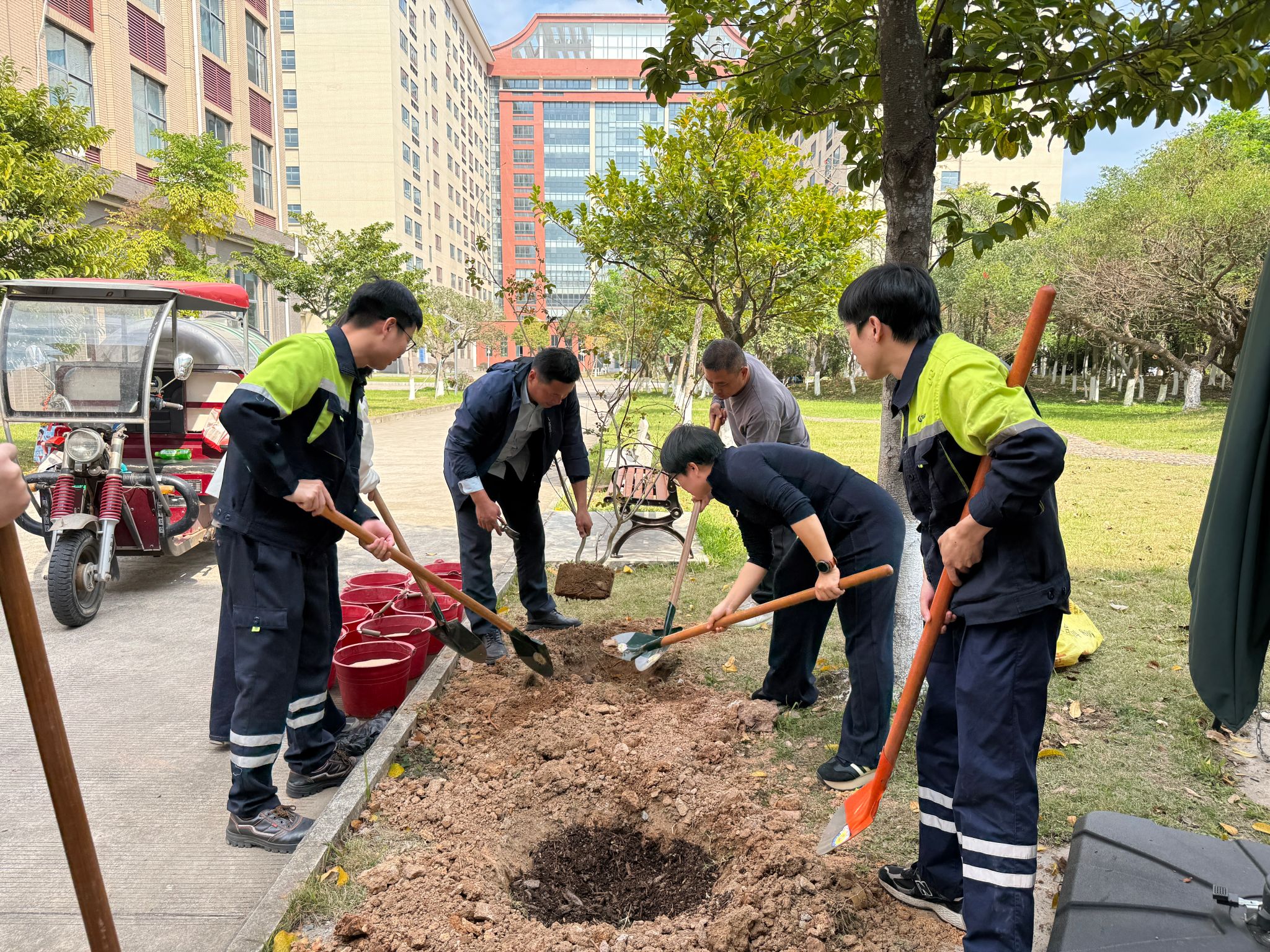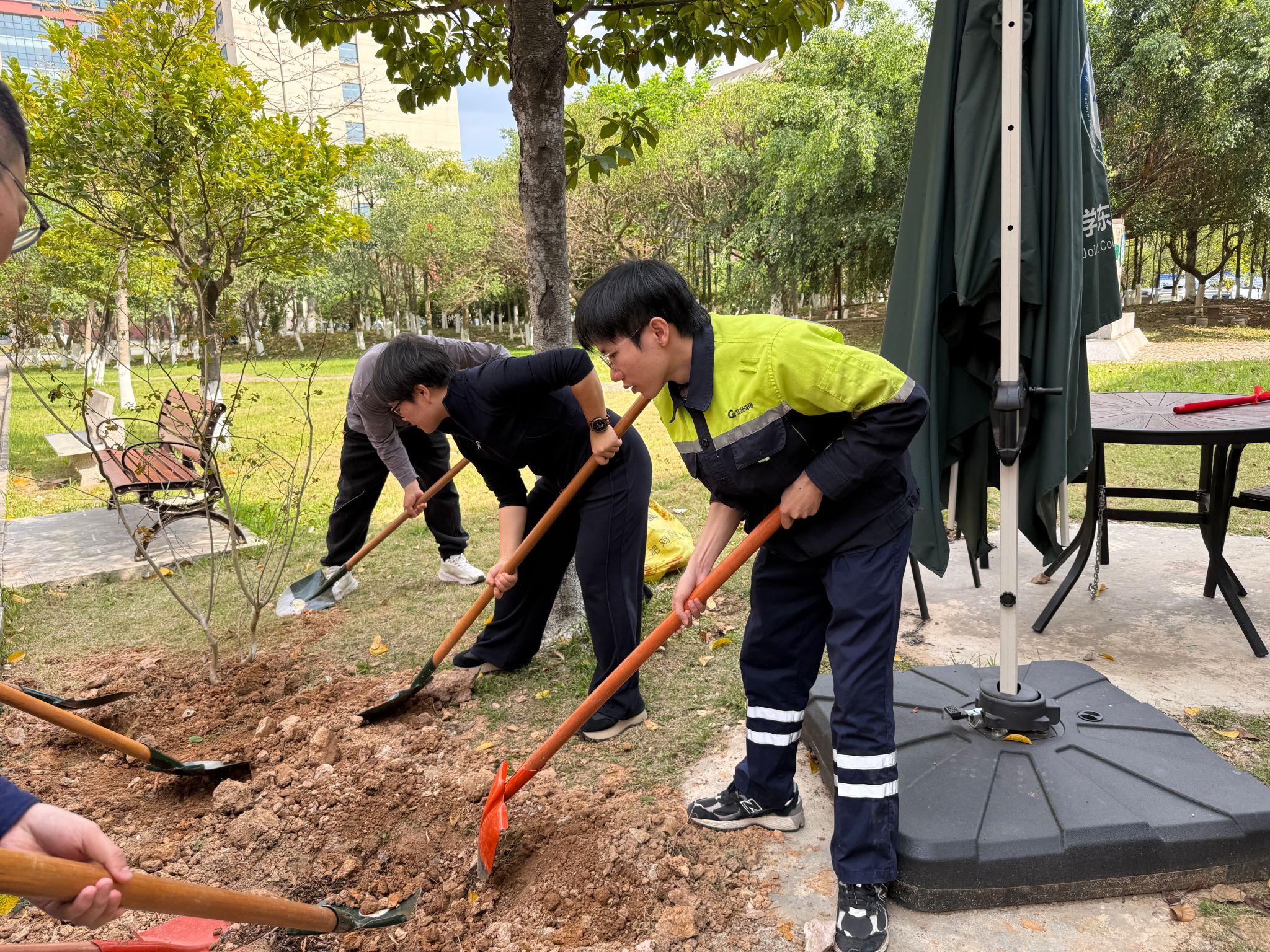 植树过程中,党员们互相交流,热情高涨、干劲十足。挥锄挖坑、扶苗定株、培土围堰、提水浇灌……经过两小时辛勤劳作,5株新栽种的树苗在春风中昂然挺立,为校园增添了一道靓丽的生态新景。