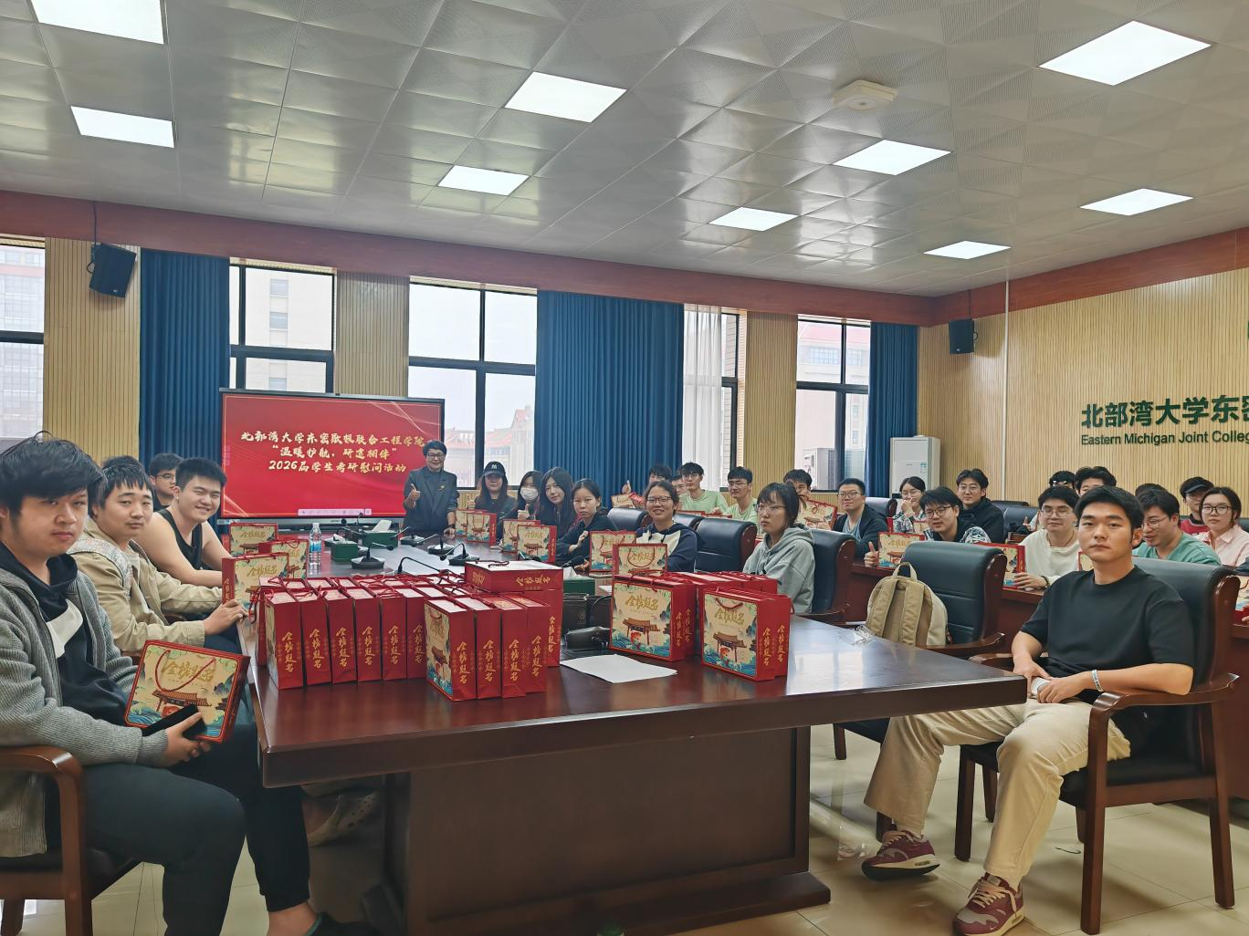 12月12日,我院在8C-402会议室顺利开展“温暖护航,研途相伴”2026届学生考研慰问活动。我院直属党支部书记韦雪敏,就业专干韦沫晴为考研学子送上祝福大礼包。